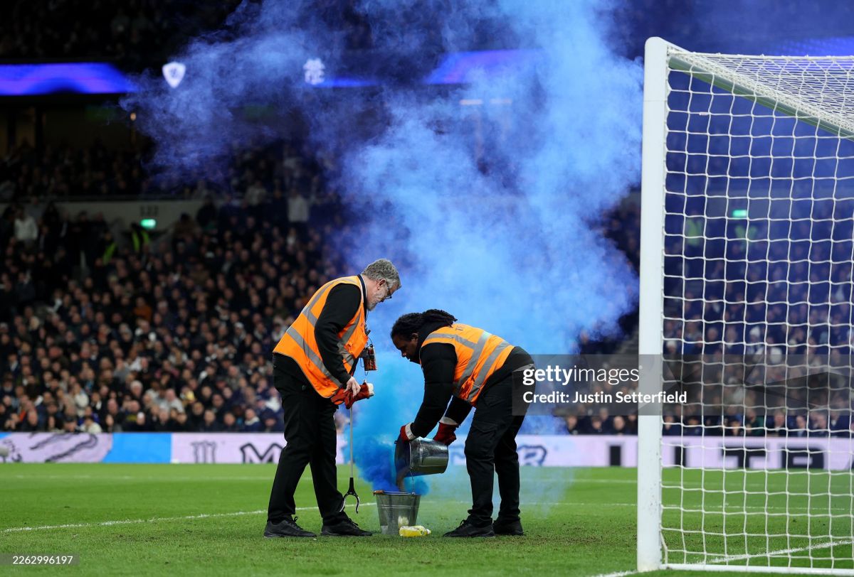78. Мухлислар томонидан Райя эгаллаб турган дарвоза олдига ранг чиқарувчи восита отилди. Стадион масъуллари уни олиб ташлашди.