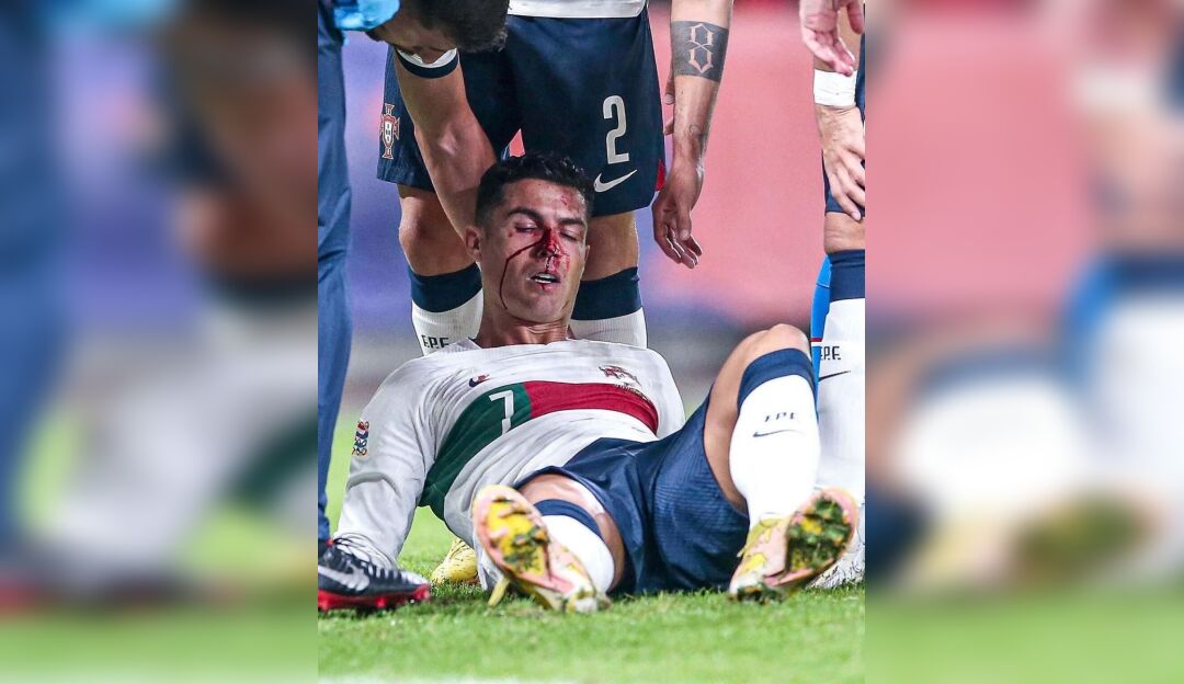 Shundan so'ng Ronalduning burni qonadi. Terma jamoa shifokorlari qonni to'xtatishga muvaffaq bo'lishdi, shuningdek, futbolchining burniga doka yopishtirishdi.