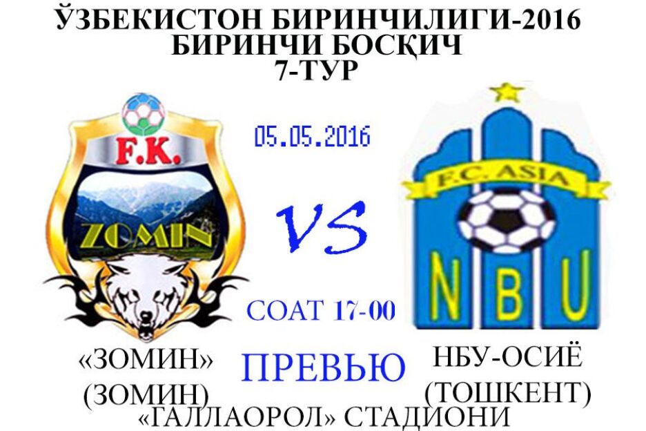 Бунда Зоминнинг “Зомин” жамоаси “Ғаллаорол” стадионида Тошкент шахрининг “НБУ-Осиё” жамоаси қабул қилади.