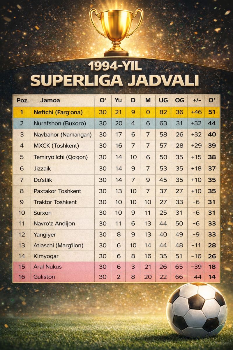 1994 yilda Superligada (Oliy Liga) 16 ta jamoa ishtirok etgan. "Neftchi" mavsumni 51 ochko bilan chempion sifatida yakunlagan, "Andijon" esa 25 ochko to'plagan holda 11-o'rinni egallagan. Farg'onaliklar hujumchisi Ravshan Bozorov 26 ta gol bilan to'purarlar poygasida birinchi o'rinni egallagan.