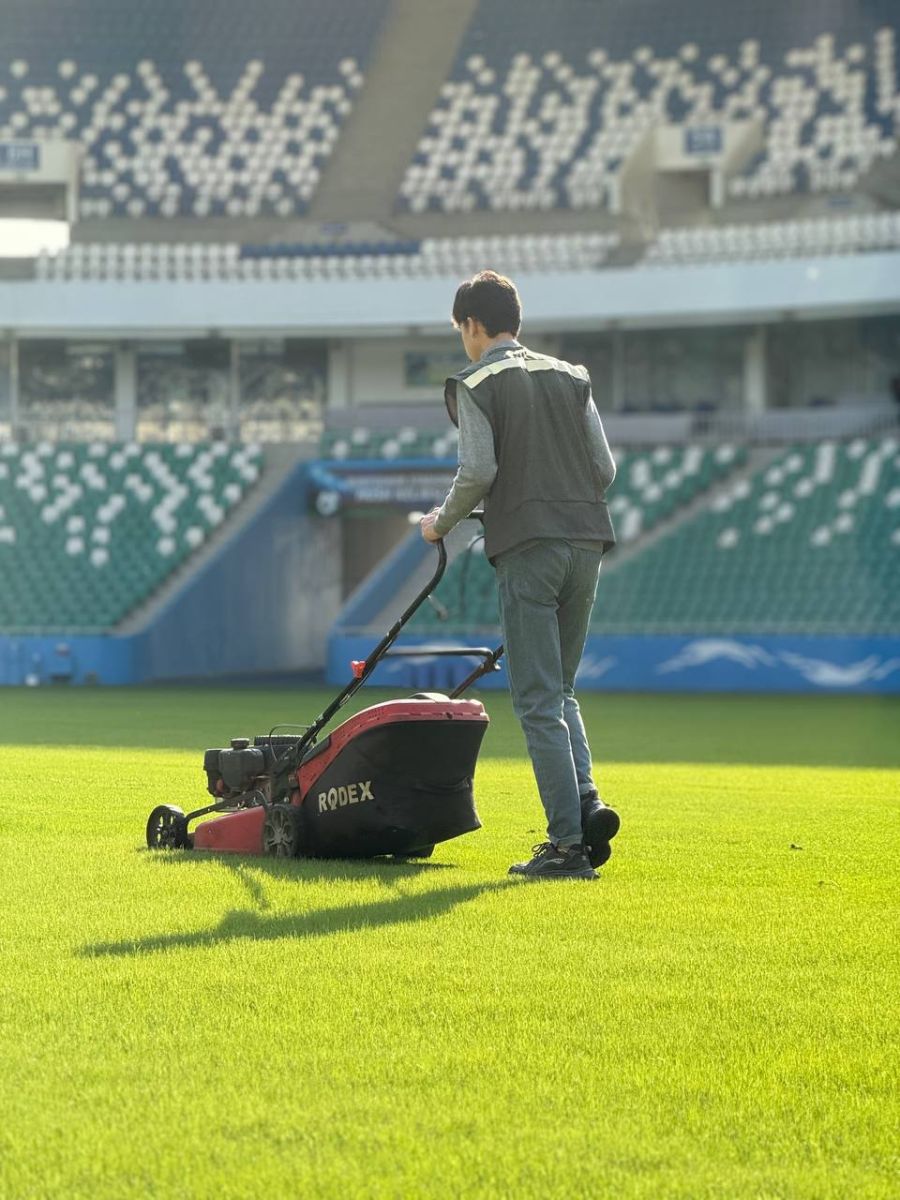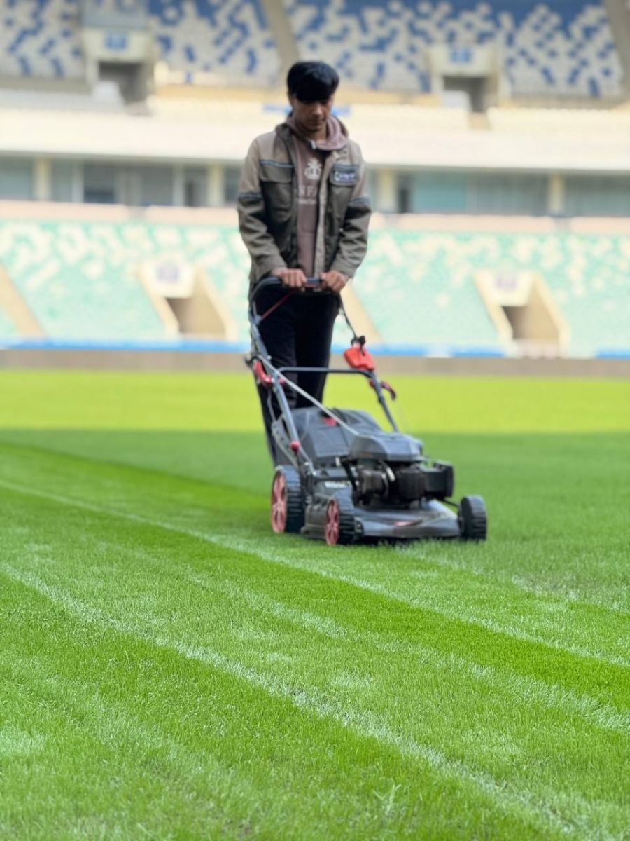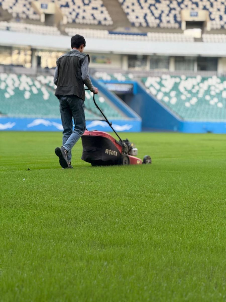 "Бунёдкор" стадиони асосий майдонида қайта таъмирлаш ишларидан кейин янги униб чиққан майсалар парвариш қилинмоқда.