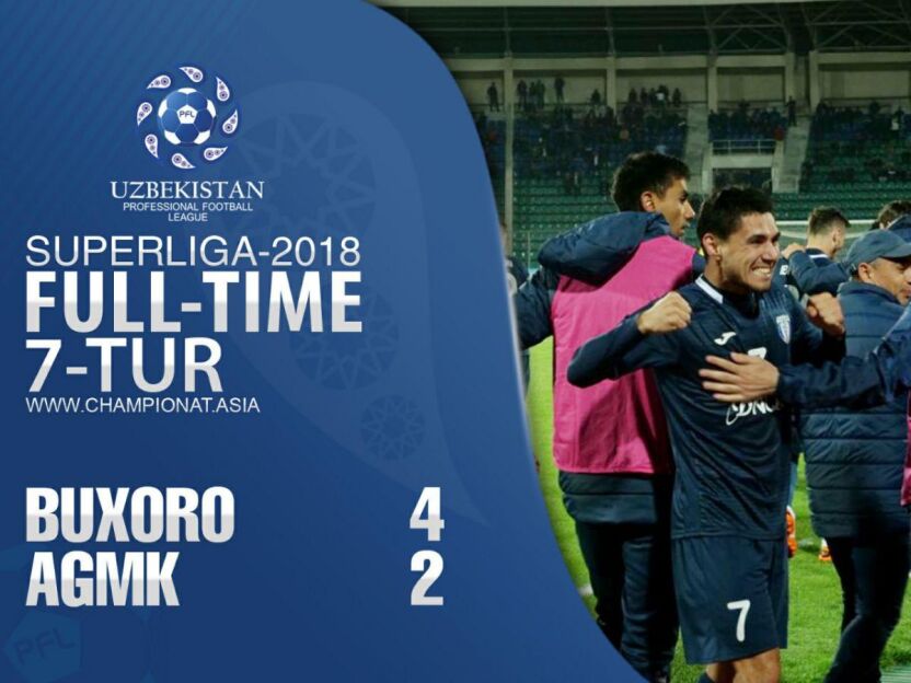 Gollar: Qahramon Bahodirov 27, - 0:1 (Lutfulla To'raev). Yovan Jokich 54 penalti, - 0:2 (Zafar Polvonov). Sergey Ruseckiy 58, - 1:2 (Sanat Shixov). Bahodir Nasimov 75, - 2:2 (Arslonmurod Omonov). Arslonmurod Omonov 81, - 3:2 (Javohir Qahramonov). Arslonmurod Omonov 88, - 4:2.