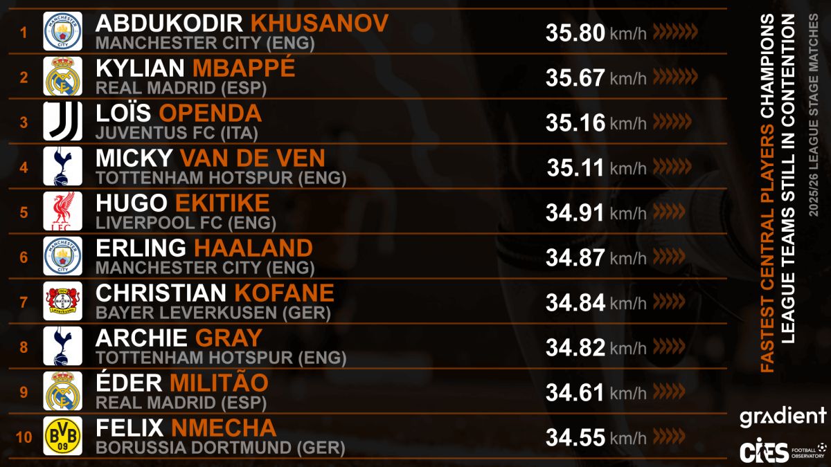 Халқаро спорт тадқиқотлари маркази (CIES Football Observatory) ЕЧЛ мусобақаси гуруҳ босқичининг энг тезкор футболчиларини маълум қилди.