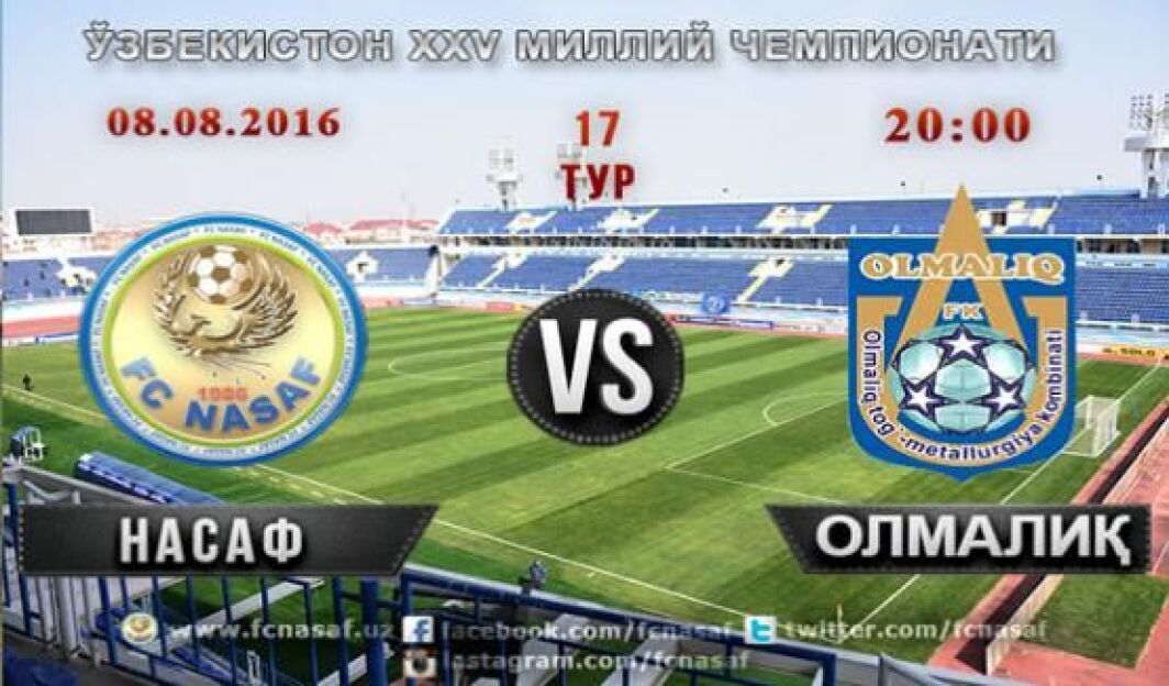 “Nasaf” jamoasi joriy chempionatning navbatdagi 17-turida “Olmaliq” jamoasi bilan bahs olib boradi. Uchrashuv 8 avgust dushanba kuni Qarshi shahridagi “Markaziy” stadionda soat 20:00da boshlanadi. Ushbu uchrashuv jamoamizning bu yilgi chempionatdagi uy uchrashuvlarining to'qqizinchisi bo'ladi.