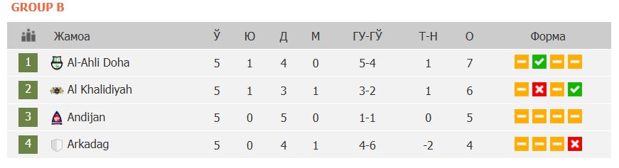 Бешта баҳсда беш очко тўплаган "Андижон"да ҳалиям кейинги босқичга чиқиш учун имкониятлар сақланиб турибди. "Б" гуруҳи етакчиси Доҳанинг "Ал Аҳли"да 4та дуранг ва 1та ғалаба (7 очко) бор.